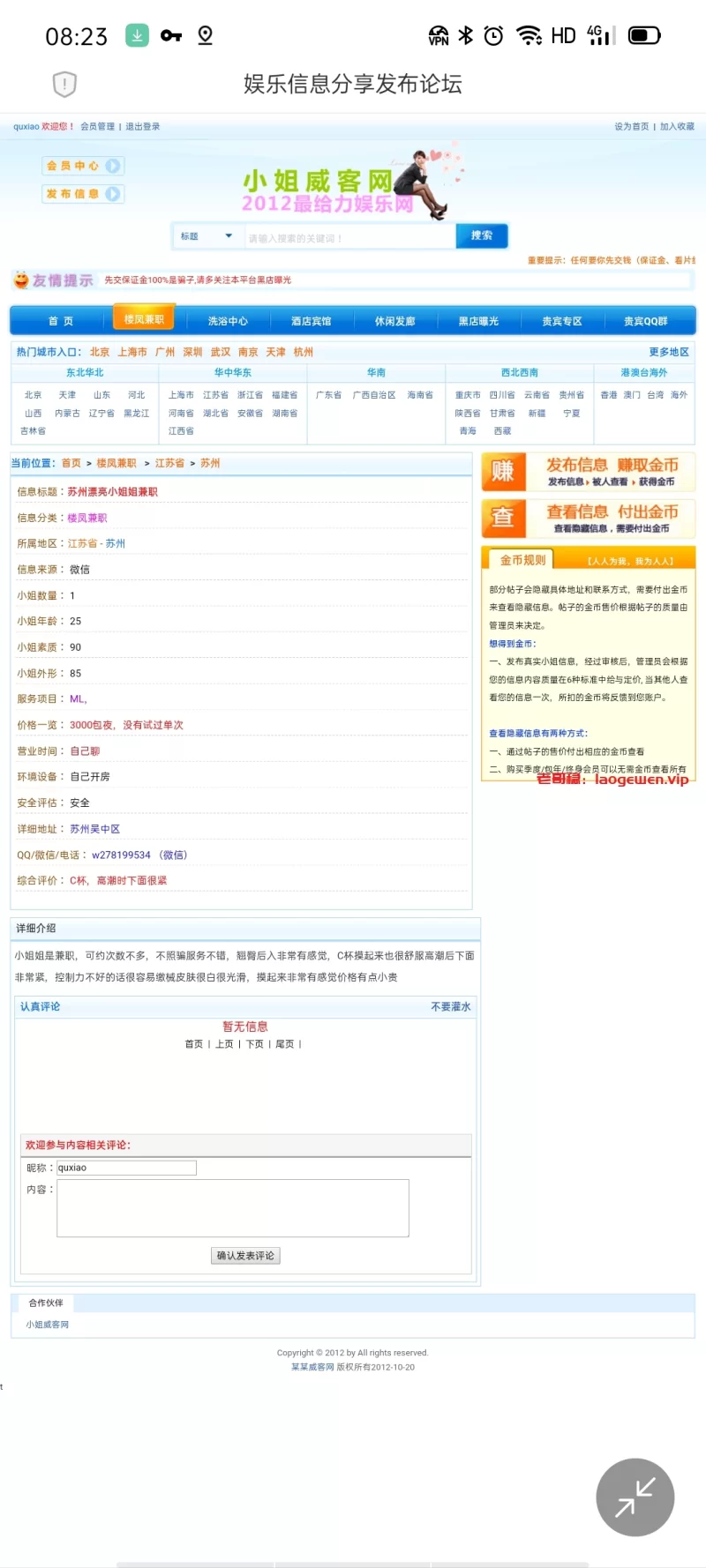 信息分类:骗子曝光 地区:江苏省-苏州 信息来源:威客 小姐数量:1 小姐年龄:1 小姐素质:1 小姐外形:1 服务项目:1 价格:1 营业时间:1 环境设备:1 安全评估:1 详细地址: (管理提示:经用户举报,此信息有诈骗行为,请勿被骗!) 联系方式: (管理提示:经用户举报,此信息有诈骗行为,请勿被骗!) 综合评价:1 详细介绍: 直接搜微信号没有,去掉w搜数字显示王者荣耀带练。 骗子曝光