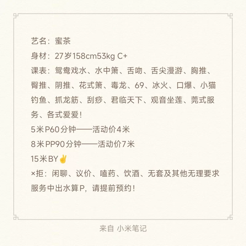 很热情开朗的姑娘,颜值中上,人照八分,胸C➕,身材匀称,口活无齿感,无纹身,能舌吻,看菜单,菜单上的都有,水多很润,顶级毒龙,会聊天不冷场,中间老师不累的情况下还有专业按摩,有茶歇吃,不催,个人最喜欢老师的翘肥臀和安排的满满的服务,房间环境温馨,回锅很多次,基本一个月四五次。